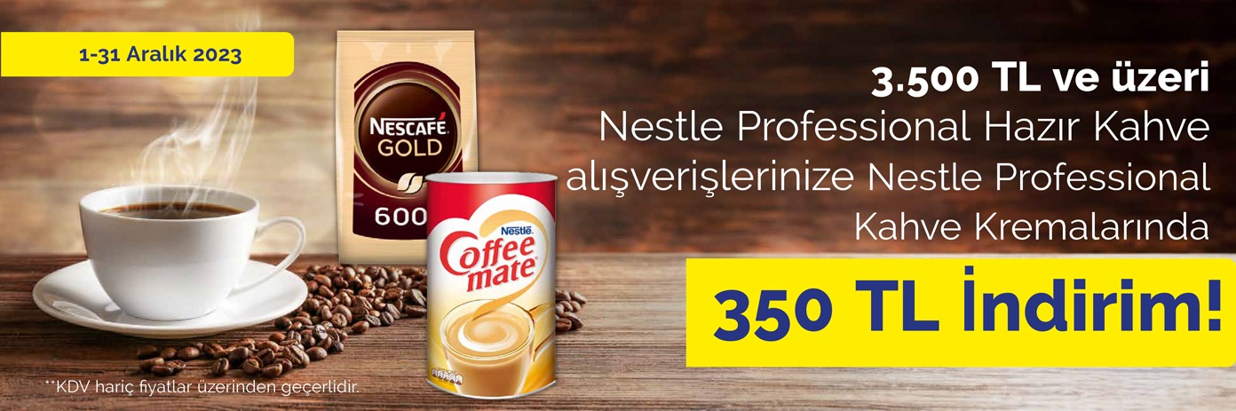 • KDV hariç 3.500 TL ve üzeri Nestlé Professional Hazır Kahve alımında, Nestlé Professional Kahve Kreması ürünlerinde KDV hariç 350 TL indirim geçerli olacaktır.
