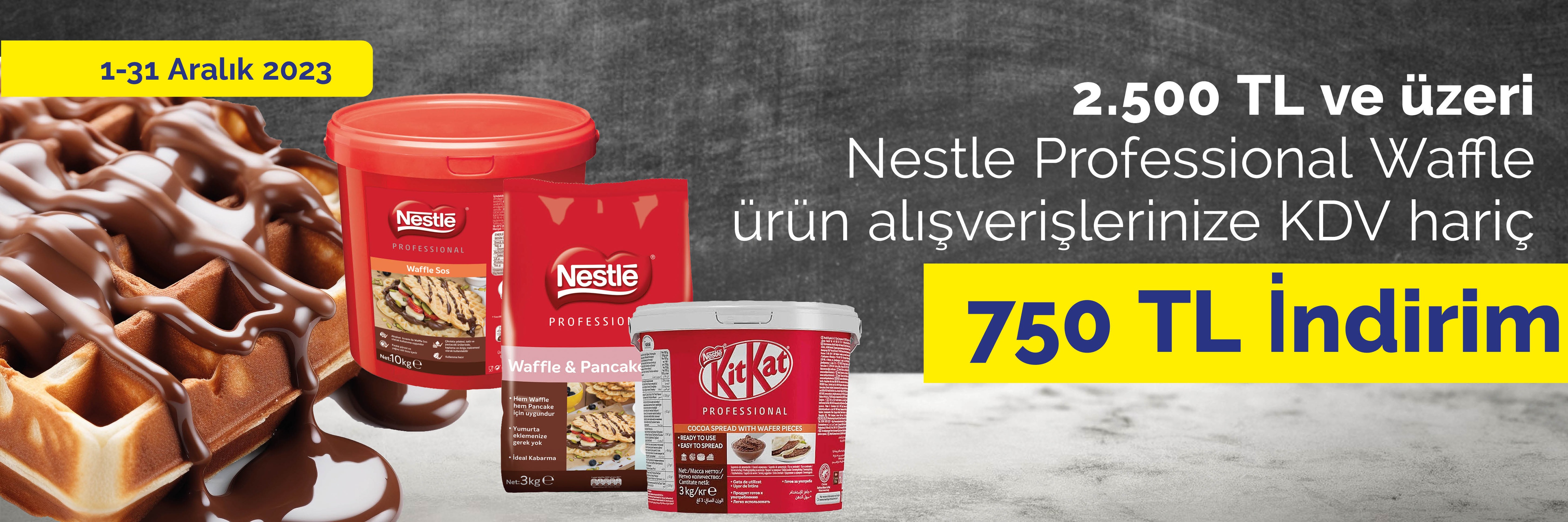 • KDV hariç 2.500 TL ve üzeri seçili Nestle Professional Waffle ürünlerinin alımında, KDV hariç 750 TL indirim geçerli olacaktır.