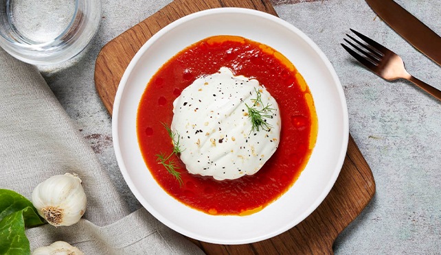 Közlenmiş kapya biberler salamura suyundan ayrılır, temiz su içerisinde 5 dk bekletilir ve durulanır. Kuru soğan, köz kapya biber ve soyulmuş patates brunoise* doğranır. Pişirme tavasına bir miktar zeytinyağı eklenir, soğan, köz kapya biber ve patates tavaya alınır ve 2 dk sotelenir. 100 ml su eklenir, 15 dk kısık ateşte pişirilir. Tuz, karabiber eklenerek tatlandırılır ve robottan çekilir.