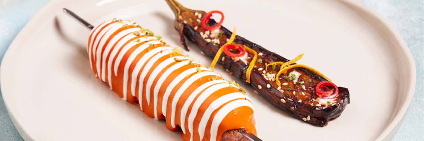 Vegan kebap ızgarada pişirilir üzerine köz kapya sos servis edilir ve en üstte olacak şekilde sıkma torbası ile yoğurt sıkılır. Hazırlanan patlıcan kebap ile birlikte tabakta servis edilir.