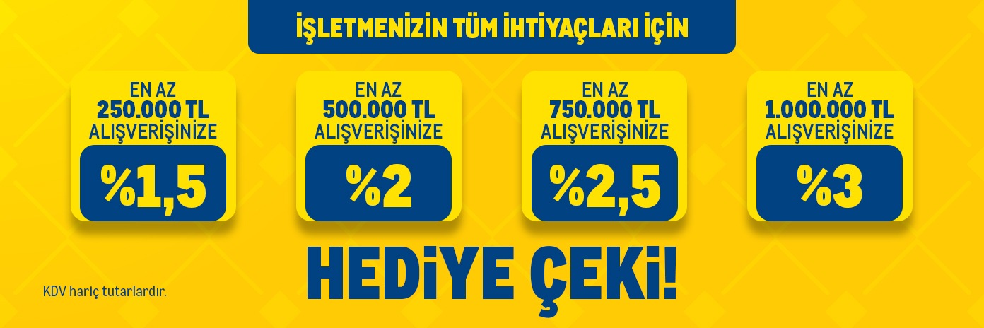KDV hariç 1.500.000 TL tutarında alım gerçekleştirilmesi durumunda hediye çek hak edişi, gerçekleştirilen cironun %3’ü oranında 45.000 TL olacaktır.