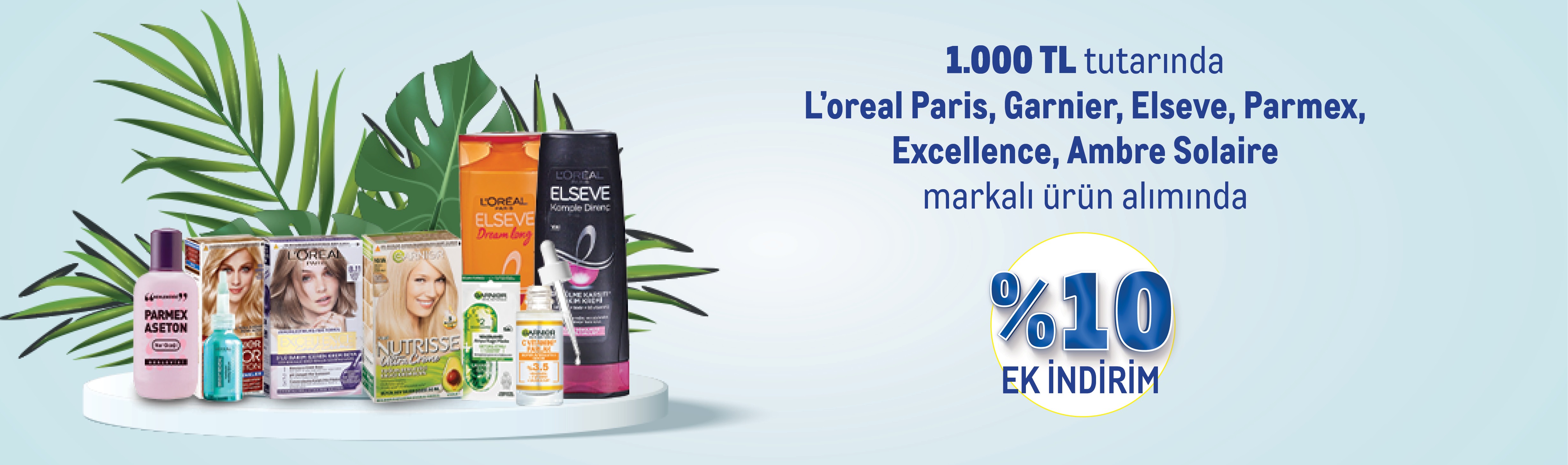 • Tek seferde KDV dahil 1.000 TL ve üzeri L’oreal Paris, Garnier, Elseve, Parmex, Excellence, Ambre Solaire markalı ürünlerin alımında %10 indirim geçerli olacaktır.