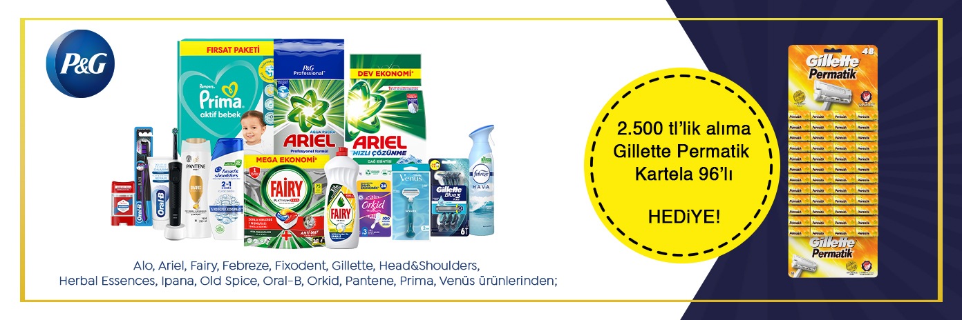 • Tek seferde KDV dahil 2500 TL ve üzeri P&G ürünleri ile yapacağınız alışverişinizde Gilette Permatik Kartela hediye olacaktır.