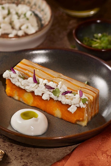 Balkabağı ve patates soyacak yardımı ile sert kabuklardan ayrılana kadar soyulur. Balkabağı ve patates dilimleyicide 2 mm kalınlığında olacak şekilde dilimlenir. Krema çektirilmek üzere ocağa alınır 2/1 oranında çeken kremaya nişasta, tuz ve karabiber ilave edilir. Dilimlenen sebzeler kremanın içerisine eklenir. Uygun fırın tepsisinin yüzeyine zeytinyağı sürülür. Bir kat balkabağı bir kat patates olacak şekilde sırasıyla toplam 5 kat dizilir. Her kat tamamlandıktan sonra yüzey alanına fırça ile zeytinyağı sürülür. İşlem tamamlanır ve tepsinin üstüne önce yağlı kağıt sonra hafif bbir ağırlık konularak sıkıştırılır.