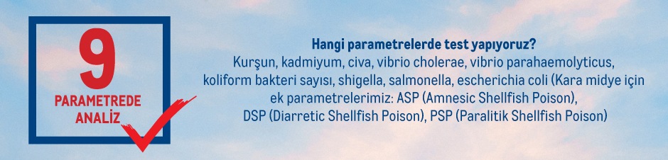 Son dönemde yaşanan musilaj sorunu nedeniyle Marmara Denizi'nden gelen deniz ürünlerini* mevcut analizlere ek 6 mikrobiyolojik test parametresi ile birlikte, toplam 9 parametrede analiz ederek, size güvenle ulaştırıyoruz. Kara midyede ise mevcut analizlere ek 3 test parametresi ile birlikte toplam 12 parametrede analizlerimizi gerçekleştiriyoruz.