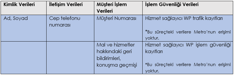 ! Tüzel kişilere ait veriler Kanun kapsamında kişisel veri olarak kabul edilmediğinden, bu metin tüzel kişi müşterilerimizi kapsamamaktadır. Ancak iletişim süreçlerine, tüzel kişiler adına yetkilileri/çalışanları dahil olmaktadır. Tarafımıza iletilen bilgilerin güncel ve yetkilisi/çalışanı olduğunuz kuruma ait olması gereklidir. Bilgilerin güncelliğinden Metro ve müşteri şirket birlikte sorumludur. İletişim sürecinde şahıslara değil, yetkilisi/çalışanı olduğunuz kurumlara ait WP hesaplarının kullanılması gerekmektedir. Görsel ve işitsel veri niteliğinde olacak; profil fotoğrafı, video paylaşımları içeren hesapların kullanılmaması gerekir.